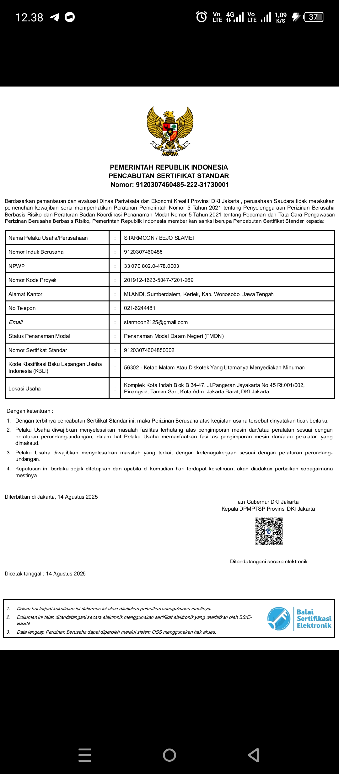 Menurut keterangan tertulis dari Dinas Pariwisata dan Ekonomi Kreatif yang disampaikan kepada media Minggu 17 Agustus 2025, dengan pencabutan sertifikat ini, perizinan berusaha dan kegiatan Starmoon tidak berlaku lagi.