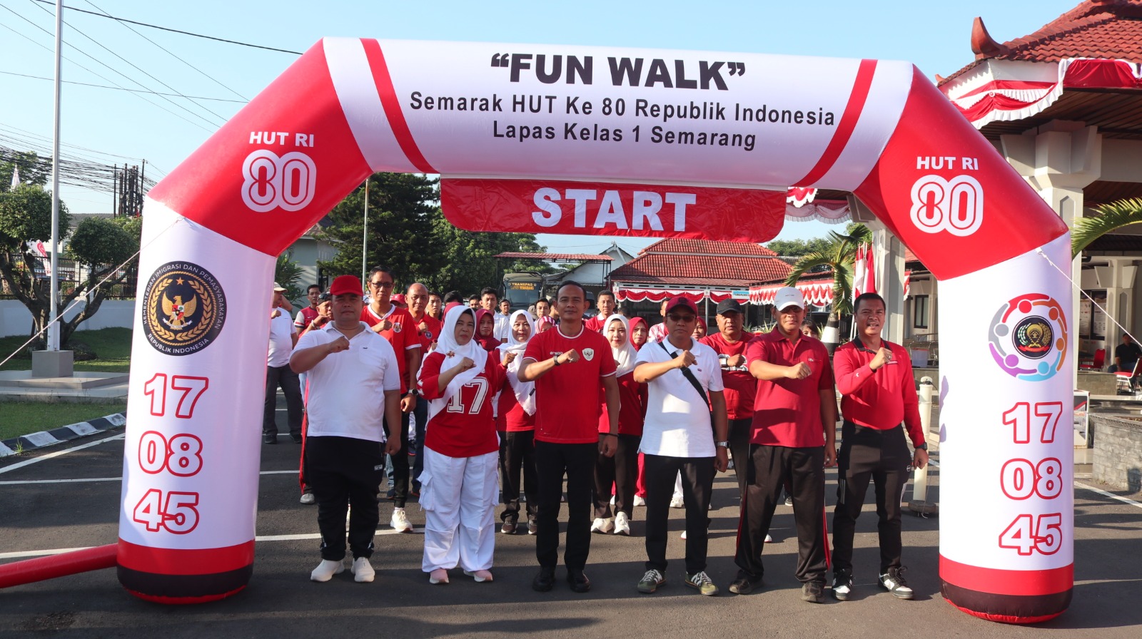 SEMARANG, JMPnews -Untuk memperingati Hari Ulang Tahun (HUT) Ke-80 Kemerdekaan Republik Indonesia, Lembaga Pemasyarakatan Kelas I Semarang menggelar Jalan Santai/ Fun Walk, Jum’at (15/08).