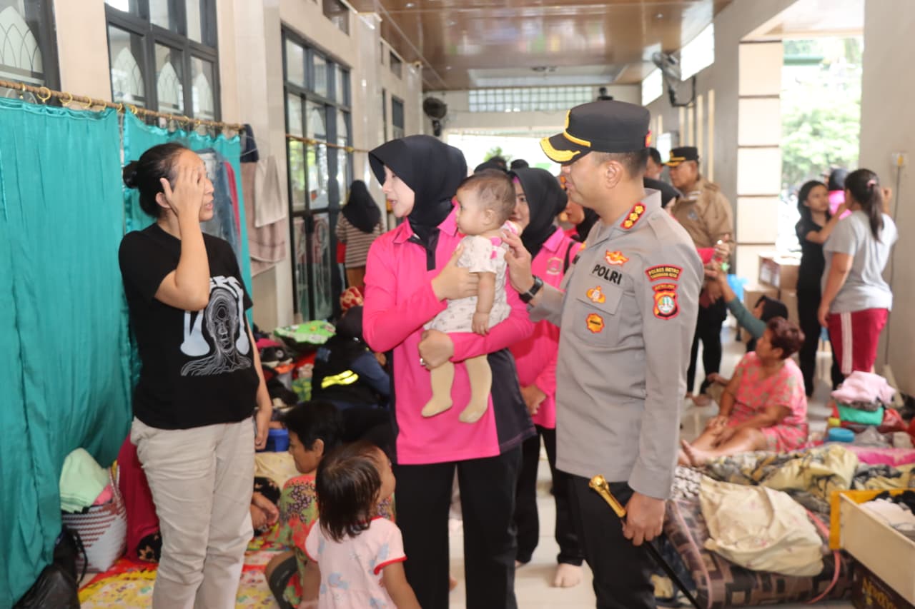 Didampingi Ketua Bhayangkari, Kamala Jauhari, Kapolres menyambangi satu per satu lokasi pengungsian, menyapa warga, berbincang dengan para orang tua, serta menghibur anak-anak yang terdampak banjir.