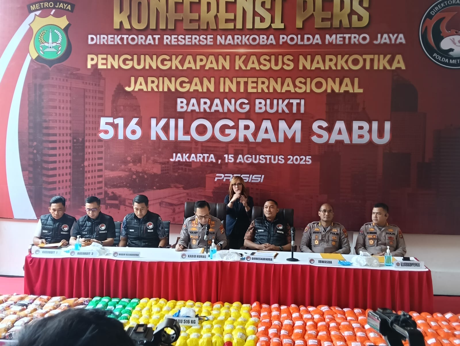JAKARTA, JMPnews – Penyidik Ditresnarkoba Polda Metro Jaya menangkap 7 tersangka narkoba jenis sabu dengan barang bukti 516 kilogram atau setengah ton lebih.