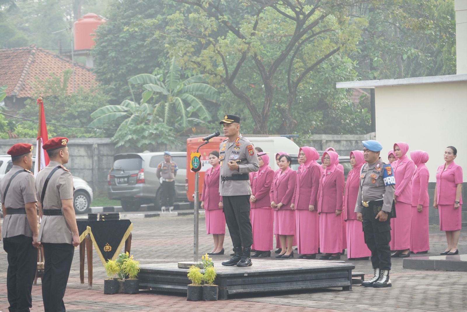Didampingi Wakapolres AKBP Apri Fajar Hermanto, S.I.K., Kapolres memimpin prosesi yang dihadiri Ketua Bhayangkari Cabang Metro Bekasi Ny. Yanti Mustofa, Wakil Ketua Bhayangkari Cabang Metro Bekasi Ny. Karina Apri, para Pejabat Utama, Kapolsek jajaran, Ketua Bhayangkari Ranting, personel Polres Metro Bekasi, PNS, serta perwakilan pengurus Bhayangkari.