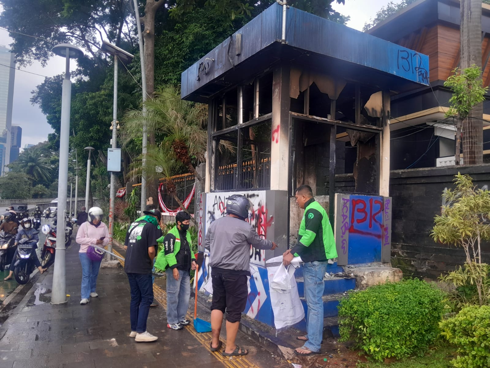 Dari pantauan awak media dilokasi, Sabtu (30/8), sejumlah pengemudi ojek online (Ojol) ikut membantu petugas kepolisian dan dibantu masyarakat pengguna jalan yang melintas untuk membantu membersihkan sampah dan puing yang tertinggal pasca aksi demo.