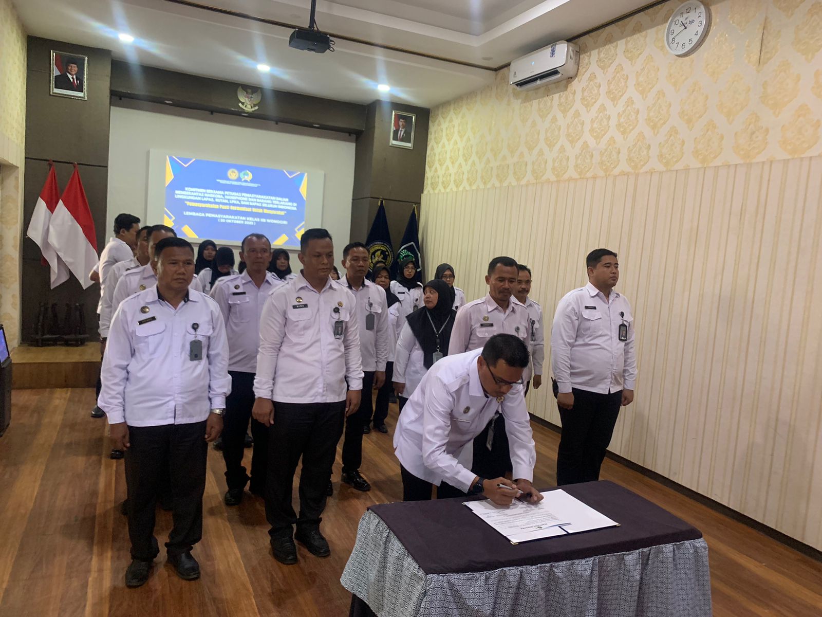 Dalam kesempatan tersebut, Kepala Lapas Kelas IIB Wonogiri, Siswarno, bersama pejabat struktural mewakili seluruh pegawai turut melakukan penandatanganan komitmen bersama sebagai bentuk keseriusan dalam menjunjung tinggi nilai integritas, profesionalitas, dan komitmen untuk menjauhkan diri dari segala bentuk penyimpangan, khususnya yang berkaitan dengan peredaran gelap narkoba, handphone, serta barang terlarang lainnya di dalam Lapas.